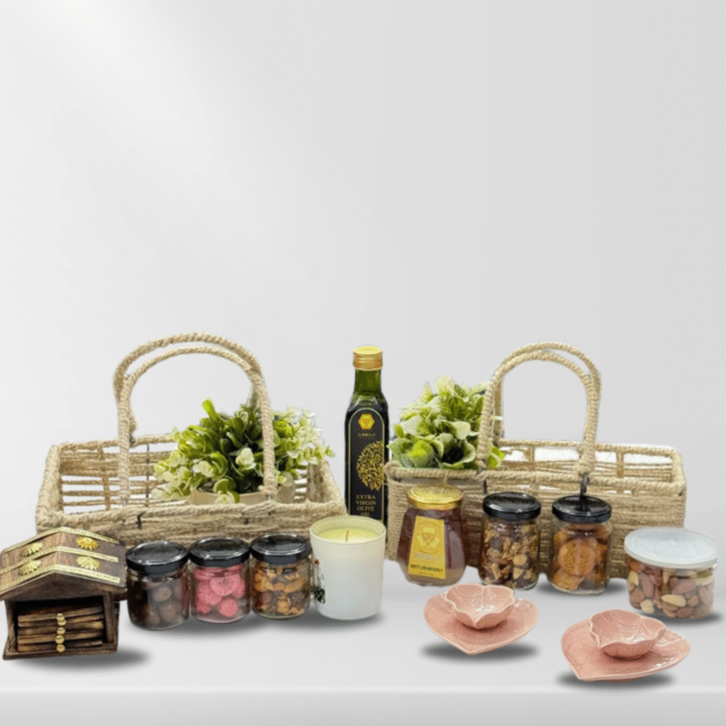 Planter, Seeded cracker, Flavoured Makhana, Granola, Mobile stand, Scented candle, Dry fruit cocktail, Honey, Olive Oil